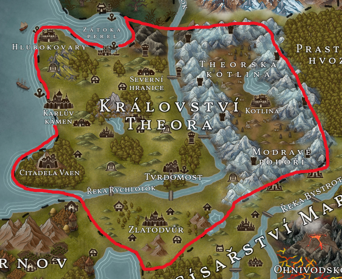 Králoství Theora si dlouhodobě drží statut nejmocnější známé země. Rozprostírá se na západě střední Lendárie, kde jeho západní hranice omývají vody Středovínského oceánu. Na severu sousedí s tajemným panstvím Fahrer, na jihu s Erijskem a Větrnovem, zatímco na východě hraničí s císařstvím Maril a Prastarým hvozdem.