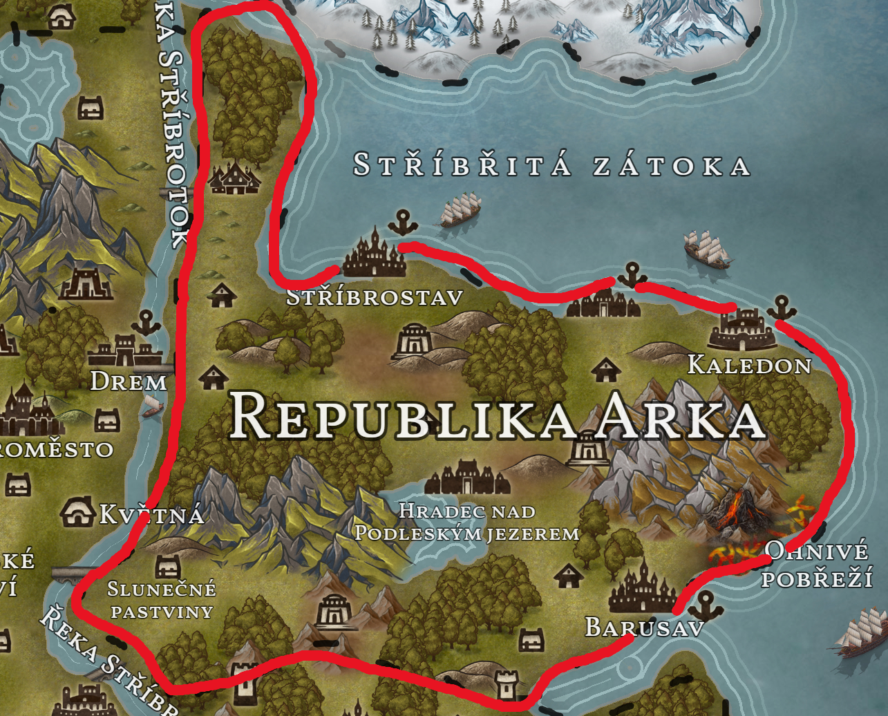 Republika Arka se rozprostírá na východním pobřeží střední Lendárie. Na západě ji od císařství Maril odděluje řeka Stříbrotok, na východě hraničí s Deštičným oceánem. Na jihu tvoří hranici druidské háje, které patří Kaštanovému pobřeží. Na severu země sahá téměř až do Zeleného údolí. Jejím severním sousedem je Sněžná, území nikoho.