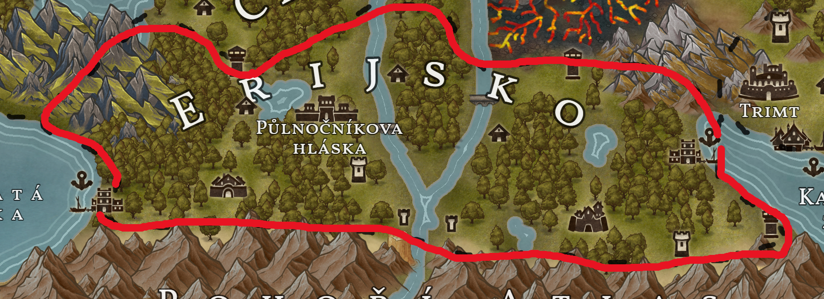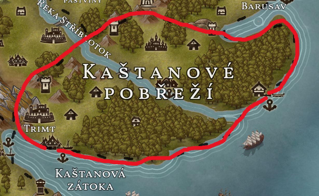 Kaštanové pobřeží je pod vládou rodu Pánů z Trimtu. Trimt, hlavní město a zároveň největší pevnost v zemi. Město nebylo nikdy dobyto. Zezadu je chráněno vysokou horou a zepředu dvacet metrů vysokými hradbami, které se táhnou do oblouku kolem celého města. Na hradbách jsou po celé délce upevněny mohutné katapulty a balisty.